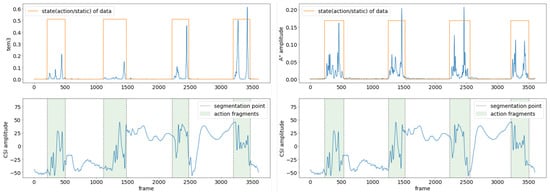 Step 3: A sliding window is applied to further process the data () to identify the start and end points of the action fragments. As the sliding window moves through with a step size of 1, the percentage of data packets that exceed the set threshold relative to all packets within the window is calculated. If this percentage exceeds the threshold p, the packets within the sliding window are classified as part of the action fragment. Specifically, to ensure the effectiveness of action fragment detection across all environments, the threshold is empirically set to four times the mean value of in the static environment, and the percentage threshold p is set to 30%. The size of the sliding window in this work is set to 50 frames. Once the sliding window has covered the entire dataset, all the start and end points of the action fragments are determined. When the sliding window passes through the entire data stream , we can divide all the data into action parts and static parts. Based on the time frames of all the action parts, we then determine the starting and ending points of all the action segments.