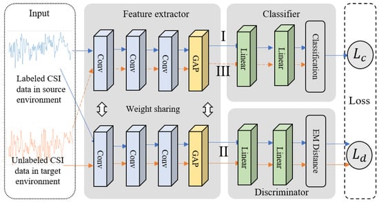 For this stage, we develop an HAR adversarial network. Specifically, we introduce a discriminator module into the basic recognition network (BRN), which consists of a feature extractor and a classifier. The goal is to measure the distance between action features from the source and target environments, and by introducing a maximum–minimum learning strategy, guide the feature extractor to map actions from both environments to a latent space where features are more independent of environmental changes. In this space, the action feature distance between the source and target environments is minimized. This leads to more robust recognition performance in the target environment. The structure of the HAR adversarial network is shown in Figure 10.