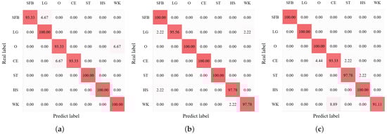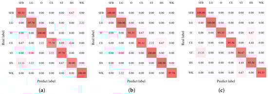 HAR accuracy (%) confusion matrix of the target environment. (a) , (b) , (c) .