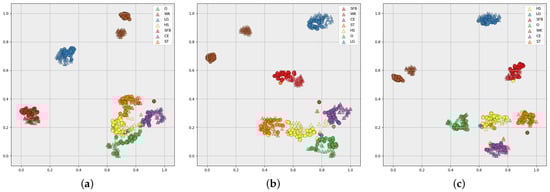 Figure 13 illustrates the visualization feature space in different stages of the CHARS using t-SNE [] for the source environment and the target environment . The triangular color blocks represent the action features in the source environment, and the circular color blocks represent the action features in the target environment. Different colors represent the different action classes. Figure 13a–c show the feature maps extracted by the BRN, the CHARS with Stage 1, and the CHARS with Stage 1 and Stage 2, respectively. We can observe in Figure 13a that there is a larger gap between some of the same action class features in the source environment and the target environment than between different classes. For example, for ’O’ and ’HS’, ’O’ in the target environment is closer to ’HS’ in the source environment, making recognition ineffective. In addition, different classes of action features, such as ‘O’, ‘ST’, ‘CE’, and ‘HS’, are confused together and difficult to distinguish effectively. This phenomenon illustrates the limitations of the source-environment-optimized recognition network for target-environment HAR. Figure 13b shows that the action features in the target environment and the source environment are better fused, as the distance between the same action category is smaller, demonstrating that the proposed adversarial training strategy can effectively extract the environment-independent action features. However, there still exists the problem of unclear boundaries between some different action classes, such as ‘ST’ and ‘HS’. In Figure 13c, the features of the same action class exhibit better aggregation, and the boundaries between different action classes are also more obvious, validating the effectiveness of the self-training stage.
