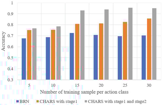 We evaluated the impact of the number of action samples on the HAR performance in the target environment. The average HAR performance of all target environments is shown in Figure 14, where the horizontal axis represents the number of samples of each action class in all environments. It can be seen that as the number of action samples increases, the HAR accuracy shows an overall upward trend, which is consistent with our expectations; that is, a larger number of samples helps to better learn action features, thus enhancing HAR performance.