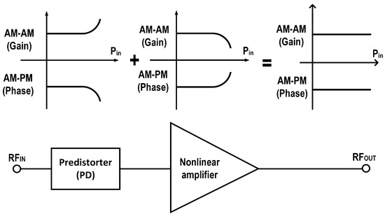 Accordingly, various linearization techniques have been investigated, and external approaches such as digital predistortion (DPD) and analog predistortion (APD) have been widely applied [5,6,7,8,9]. While DPD has become the mainstream solution in recent years, it requires high-speed data converters, complex digital signal processing, and significant power consumption, which may limit its applicability in compact and low-power systems. In contrast, APD offers several advantages, including lower power consumption, real-time operation without latency, and simplified hardware implementation. The APD techniques include feedback [5], feedforward [6], and predistortion [7,8,9]. The feedback technique offers advantages in linearity and stability but results in reduced gain. Feedforward linearization achieves significant improvements in linearity but requires an additional error amplifier, complicating its integration as an IC. Predistortion linearization typically provides moderate linearity enhancements at a relatively low additional cost and benefits from its compact size, low complexity, and enhanced stability. As depicted in Figure 1, predistortion linearization operates by flattening the overall AM−AM and AM−PM characteristics through a predistorter, which possesses characteristics opposite to those of a nonlinear PA. Consequently, this results in linear signal amplification at the output.