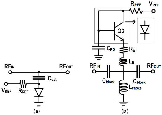The conventional shunt diode predistorter depicted in Figure 2a uses a biased diode connected in parallel to the RF signal path with a series capacitor () [9]. directly affects the RF power coupling to the predistorter. The voltage distribution across the predistorter is divided between the diode and . The nonlinearity of the diode is represented by a nonlinear resistance, , which is adjustable through the reference voltage (). Thus, the conventional predistorter, with two parameters ( and ), offers limited control over its ability to compensate for the dynamic nonlinear characteristics of PAs.