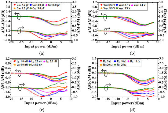 Figure 3 illustrates the simulated AM−AM and AM−PM characteristics of the predistorter based on various tuning parameter values, such as , , , and . Figure 3a depicts the AM−AM and AM−PM characteristics for five distinct values of with a of 3.1 V, of 300 , of 3 nH, and of 15 . As decreases, capacitive degeneration intensifies, leading to a significant increase in AM−PM variation. Particularly for values above 3 pF, the AM−PM variation becomes pronounced, while the AM−AM characteristics show limited change with dynamic responses involving compression and expansion. Figure 3b demonstrates the AM−AM and AM−PM performance for five varying values of with an of 300 , a of 5 pF, an of 3 nH, and an of 15 . As decreases, the predistorter facilitates earlier and more pronounced variations in both AM−AM and AM−PM characteristics. Figure 3c showcases the AM−AM and AM−PM performance for five different values of with a of 3.1 V, an of 300 , a of 5 pF, and an of 15 . Smaller values lead to greater RF signal coupling to the diode, which amplifies both the variation and dynamism in the AM−AM and AM−PM characteristics. For high values, the AM−PM characteristics tend to expand further. Figure 3d displays the AM−AM and AM−PM characteristics for five different values of with a of 3.1 V, an of 300 , a of 5 pF, and an of 3 nH. Smaller values enhance RF signal coupling to the diode, inducing greater variation across a relatively higher-input power spectrum.