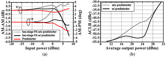 Simulated performances of the two-stage HBT PAIC with and without the predistorter: (a) AM−AM and AM−PM characteristics, (b) ACLR using the 5G NR modulated signal.