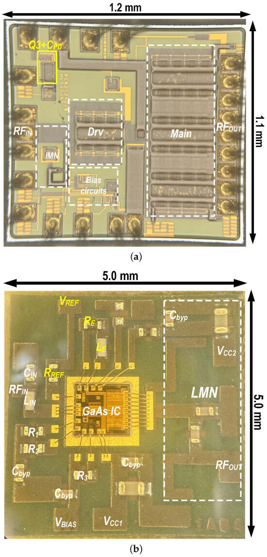 - Liu, M.; Ma, Z.; Ma, K.; Fu, H. A High-Power GaAs Amplifier with Coupled BondingWires-Based Harmonic Control Output Matching Network. IEEE Microw. Wireless Technol. Lett. 2023, 33, 1305–1308. [Google Scholar] [CrossRef]