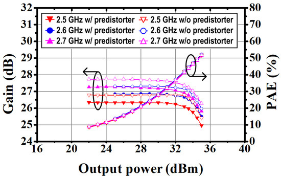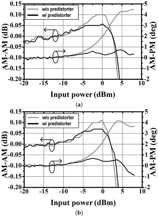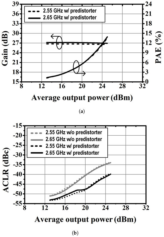 Figure 7 shows the measured gain and PAE of the implemented PAIC with and without the predistorter using a CW signal. After applying the predistorter, the PAIC exhibited a gain of approximately 26.5–27.1 dB and a PAE of about 53% at an output power of 35 dBm across the 2.5–2.7 GHz frequency range. Compared to the case without the predistorter, a gain reduction of approximately 0.5 dB and an efficiency degradation of around 0.5% were observed. Figure 8 displays the measured AM−AM and AM−PM characteristics of the implemented PAIC with and without the predistorter using a CW signal at 2.55 GHz in Figure 8a and 2.65 GHz in Figure 8b. With the predistorter for both frequencies, it is observed that the saturated output power is extended by approximately 0.05 dB according to the AM−AM characteristics. These characteristics appear noticeably flatter. The AM−PM characteristics also demonstrate an improvement of more than 3°.