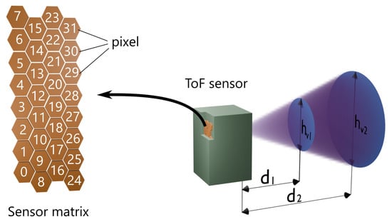 The system utilizes a Time-of-Flight sensor, AFBR-S50MV85I (Broadcom Inc., San Jose, CA, USA), emitting laser light with a wavelength of 850 nm and an emission angle of 13° vertically and 6° horizontally. The reflection of light from the object is received by a matrix composed of 32 pixels arranged in four columns of 8 pixels, forming a hexagonal pattern with a size of 150 μm per pixel. The arrangement of these pixel columns, offset relative to each other (see sensor matrix on Figure 1), ensures spatial efficiency and uniform measurements while minimizing image artifacts. The field of view (FOV) of the matrix is 12.4° vertically and 5.4° horizontally. The key technical data for the sensor used are presented in Table 2.