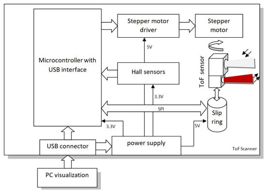 The heart of the device is the STM32F401RCT6 processor (STMicroelectronics, Geneva, Switzerland), which is housed on a custom-designed PCB (main board). This board is connected via a slip ring and a special 3D-printed structure to the ToF sensor mounted on its dedicated PCB (ToF board). Communication between the sensor and the processor occurs through the Serial Peripheral Interface (SPI) bus. A stepper motor located at the top of the structure provides rotational movement and is controlled by a stepper motor driver via the Microcontroller Unit (MCU). This driver handles the microstepping operation. The speed control and number of steps are implemented using the microcontroller hardware counter. Hall sensors mounted on the main board enable the processor to determine the sensor position. As the sensor rotates, it passes through a zero point, triggering a sequence of signals from the Hall sensors. The processor communicates with a computer or an external device via a USB, which also serves as the power source for the entire system. This eliminates the need for an additional power supply. Due to the shared power supply for the stepper motor and the electrical components, including the Time-of-Flight (ToF) sensor, the PCBs were carefully designed. The power lines were routed independently, utilizing LC filters and linear regulators, and the ground planes were designed to limit the propagation of disturbances. During testing, no negative impact on measurement results was observed when comparing the PCB with the stepper motor to the one without it. A scanner block diagram can be found in Figure 3.