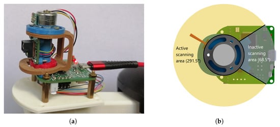 The estimated scan times for the 270° scanning range and ms and ms are 144 ms and 288 ms, respectively, and were confirmed during experiments. During a full scan rotation, the active scanning area covers 291.5°, while the inactive area covers 68.5°. This inactive area arises from the scanner design and may increase depending on its location in the wheelchair (Figure 4).