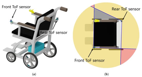 (a) Visualization of the placement of two Time-of-Flight scanners on a wheelchair. (b) Top-down view of the wheelchair with marked zones: active scanning (yellow), dual scanning (red), and inactive (gray).