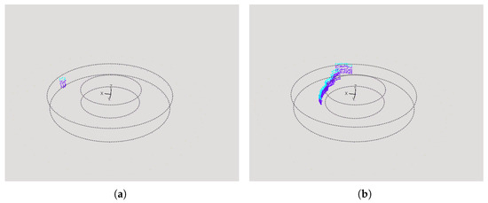 Using Equation (4), the sensor’s rotation time to the next measurement position (with an angle of 5.625°) is 2 ms. The ToF sensor has the possibility of increasing the measurement accuracy by extending the measurement time. The increase in accuracy is related to performing a larger number of intermediate integrations of the results. In the current version, a variable measurement time () ranging from 1 to 4 ms is used. Taking into account the above and Equation (4), the time for one scan for a selected range is as follows: