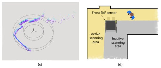The detailed process of 3D map generation from scanner data, including the computation of local XYZ coordinates and their transformation into global coordinates using SLAM, is described in Appendix B (see Figure A2). The subsequent stages of the mapping process are illustrated in Figure 7. Figure 7a shows the result of a single measurement, which is limited to the scanner’s field of view. Figure 7b,c demonstrate the accumulation of multiple measurements taken from different sensor positions, progressively building a more comprehensive environmental representation. Ultimately, the final result is a three-dimensional map of the environment, offering a detailed spatial reconstruction. Additionally, Figure 7d provides a schematic representation of the room where the experimental test was conducted.