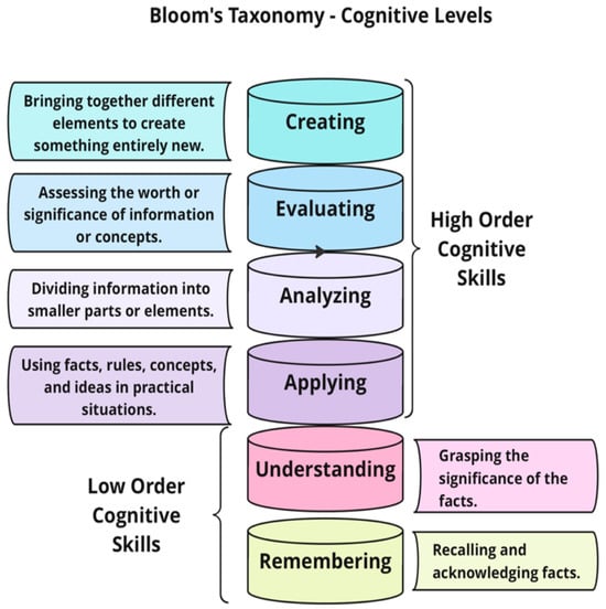 Assessing students’ cognitive abilities is a crucial element in modern pedagogical strategies []. Central to this approach is Bloom’s taxonomy, a framework that classifies educational objectives based on a hierarchy of complexity and specificity []. This taxonomy was developed by Benjamin Bloom and his colleagues in the mid-20th century. It organizes learning objectives into three domains: cognitive, affective, and psychomotor. The cognitive domain attracted the most attention as it focuses on intellectual skills fundamental to education. The domain is divided into six hierarchical levels: remembering, understanding, applying, analyzing, evaluating, and creating [,]. These levels progress from basic recall of facts to more complex tasks such as generating new ideas or products, providing instructors with a structured framework for designing curricula and assessments that foster comprehensive cognitive development []. The first two levels, remembering and understanding, are referred to as lower-order thinking skills (LOTS), while the remaining four—applying, analyzing, evaluating, and creating—are categorized as higher-order thinking skills (HOTS). Although LOTSs are important, memorization and comprehension alone are insufficient in the modern educational context. HOTSs have become increasingly critical for university students and are considered essential for academic success [].