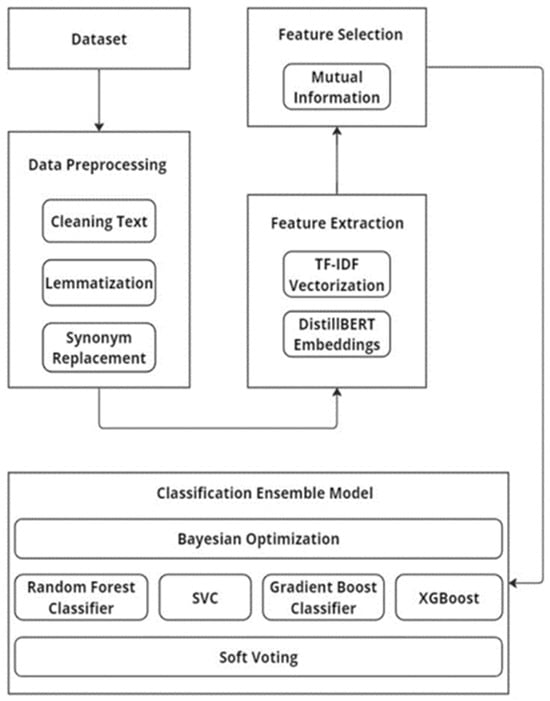 The superior performance of our approach confirms that the combination of DistilBERT, TF-IDF, and the implementation of the ensemble model using soft voting significantly enhanced these capabilities. The soft-voting ensemble not only aggregated the diverse strengths of multiple classifiers, but also adjusted the influence of each classifier based on its prediction confidence. This approach allowed for more nuanced decision-making, which was important in scenarios where classifiers disagreed. Empirical results show that the ensemble model achieved an accuracy of 96% and a macro-F1 of 0.96 when combining TF-IDF and DistilBERT with preprocessing and augmentation, surpassing the individual classifiers’ best accuracy of 94% (gradient boosting) under similar conditions. This quantifies the ensemble’s contribution and confirms that while individual feature representations substantially aid classification tasks, the ensemble method distinctly amplifies these effects, ensuring superior performance through collaborative decision-making. This finding underscores the synergy between advanced feature engineering and strategic classifier integration, establishing the ensemble’s pivotal role in achieving the reported high accuracy.