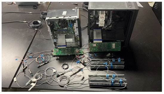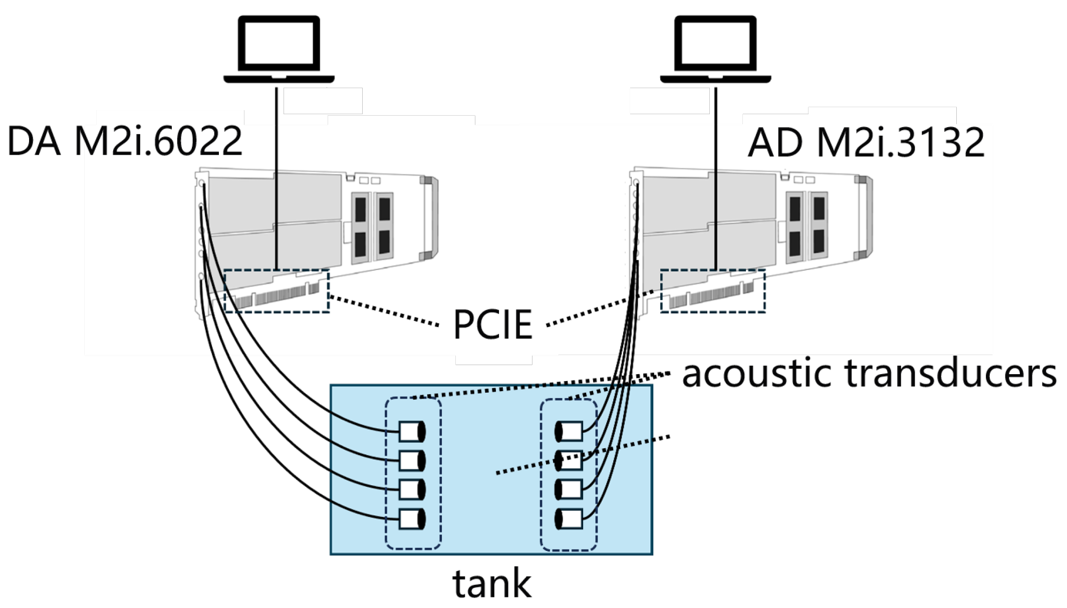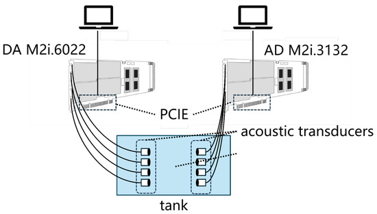 To characterize suspended solids in water bodies using multi-frequency acoustic information, a multi-frequency acoustic information acquisition device capable of simultaneously transmitting and receiving acoustic signals was constructed by the authors. The device consists of four pairs of acoustic transducers. The four types of underwater acoustic transducers used in our experiments are produced by Hangzhou Anbuleila Automation Technology Co., Ltd. (Hangzhou, China). The performance parameters of the transducers are shown in Table 1. Signal transmission is handled by an M2i.6022 D/A converter board (Spectrum Instrumentation, Grosshansdorf, Germany), while reception utilizes an M2i.3132 A/D converter board (Spectrum Instrumentation, Grosshansdorf, Germany). Two PCs control signal transmission and reception, respectively. The output channels of the A/D converter board are connected to the acoustic transducers. The schematic connection and actual object diagram are shown in Figure 1 and Figure 2, respectively. A total of 216 sets of received signal data were collected, covering four frequencies, nine concentrations, three particle sizes, and two types of transmitted signals. The generated digital transmission signals contained 4096 points per period. The D/A converter board sent signals cyclically, with a sampling rate of 32 MHz. The A/D converter board processed the received signals at a sampling rate of 20 MHz, resulting in data with 2560 points per period.
