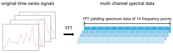 Figure 3 illustrates the method used to construct input data samples for the neural network. Multi-channel features were constructed by allocating FFT-processed frequency bands (14 points/channel) to separate input dimensions, avoiding concatenation artifacts. The frequency band information was constructed as a multi-channel input feature by increasing the number of channels.