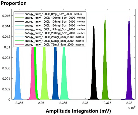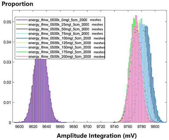The original time-series signals had to be subjected to feature extraction before they could be effectively used for classification tasks. Signal energy, which can intuitively and simply represent the phenomenon of sound attenuation, was chosen as an indicator. We calculated the energy of each time-series signal sample using amplitude integration and analyzed the energy distribution of the dataset. Figure 4 and Figure 5 show the energy distribution of the lfm05 and lfm10 datasets, respectively, for samples with a particle size of 2000 mesh. When the transmitted signal frequency was low, the energy distribution was wider, with larger variance and more overlap. At higher frequencies, the mean energy values for different concentrations were more dispersed, individual energy variance was smaller, and energy was more concentrated. However, there is no obvious linear relationship between energy and concentration. When using Bayesian discriminant analysis for classification, we cannot distinguish among concentrations of suspended solids within the range of overlapping energy distributions. Therefore, we need neural networks to automatically extract more features that can help to differentiate among concentrations of suspended solids and particle sizes.