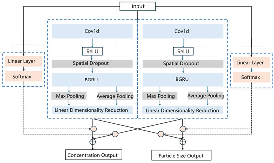 Figure 8. Two Conv1D-BGRU networks are employed to separately accomplish the tasks of determining concentration and particle-size classification, with soft parameter-sharing implemented between them. - MG2: Conv1dBGRU-TCN ensemble with shared feature distillation (Figure 9)