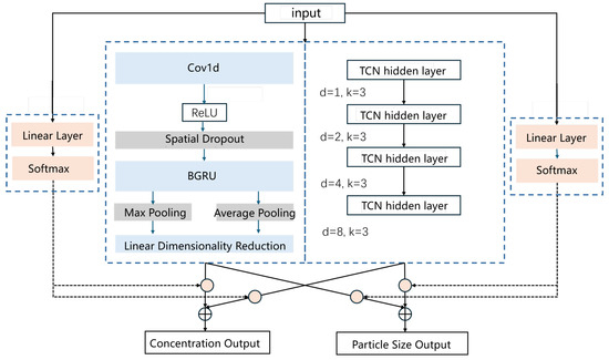 Figure 9. The Conv1D-BGRU network for concentration prediction and the TCN network for particle-size classification perform soft parameter-sharing.