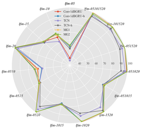 The accuracy of concentration detection by the two soft parameter-sharing networks on the LFM validation set gradually increased with the frequency band, and the accuracy of particle-size detection was almost 100% in all cases. The performances of models MG1 and MG2 on the LFM validation set after training are shown in Table 6. The accuracy of concentration detection by the MG1 model in multi-task learning was almost higher than that of the single-task Conv1dBGRU model, and the accuracy of concentration detection by the MG2 model was comparable to that of the MG1 model. The performances of the two soft parameter-sharing models were better than those of the hard parameter-sharing models. Figure 10 and Figure 11, respectively, show the accuracy values and F1 scores of different models on each validation set in the form of radar charts.