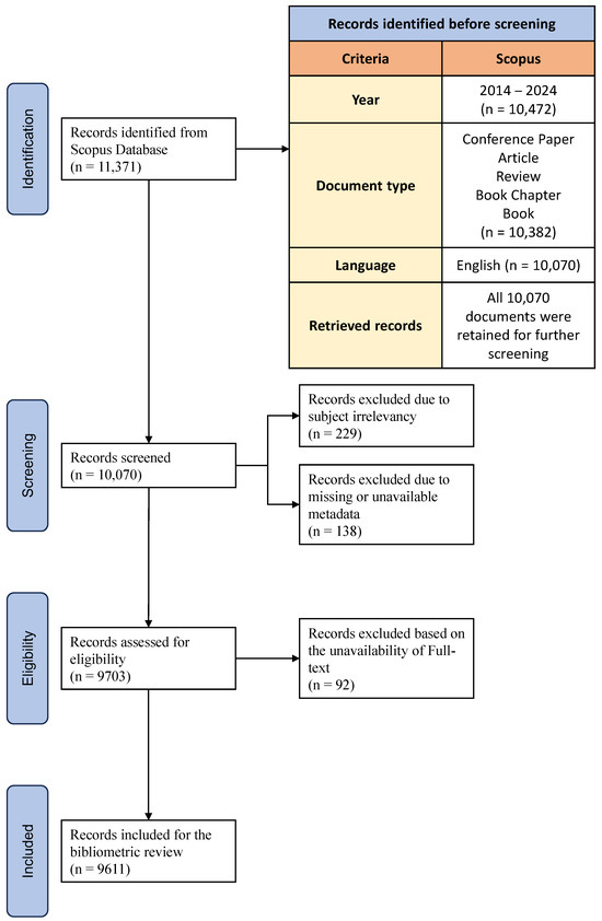 The process begins with the identification stage, where a total of 11,371 records were retrieved from Scopus. These records were initially refined based on specific criteria, including publication years (2014–2024), document types (conference papers, articles, reviews, book chapters, and books), and language (English). After applying these criteria, 10,070 documents were deemed suitable for further screening.
