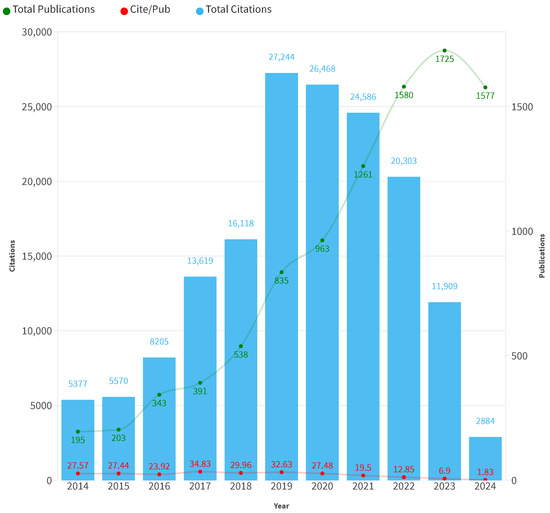The analysis was performed using a collection of bibliometric tools, such as Bibliometrix R, which, along with its graphical user interface (GUI) extension, biblioshiny, was utilized for comprehensive bibliometric analysis. This R-based package offers a wide range of functionalities for exploring publication trends, authorship patterns, and citation networks [30]. In addition, Flourish was used to create our visualizations, seeing as the tool offers a range of templates and customization options for various types of charts, maps, and other types of visualizations. Lastly, VOSviewer was utilized for visualizing and analyzing bibliometric networks, particularly co-authorship and co-citation networks. This tool offers advanced network analysis capabilities, helping to identify research communities and influential publications within one or multiple fields [31].