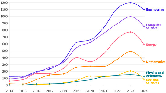 The analysis of 9611 publications from 2014 to 2024 reveals a transformative shift in smart grid research, driven by the evolution of AI and blockchain technologies. The exponential growth in publications (92.33% post-2014) aligns with global urgency to address cybersecurity threats and decarbonize energy systems [6]. China’s dominance (33.31% of publications) reflects its strategic prioritization of smart grid modernization, while the high citation impact of institutions in Singapore and Denmark underscores the value of interdisciplinary collaboration and quality-focused research. The predominance of “Engineering” (66.77%) and “Computer Science” (57.35%) in subject areas (Figure 5) highlights the field’s technical focus, though the rising trajectory of “Energy” (40.17%) signals growing emphasis on sustainability. Journals such as IEEE Transactions on Smart Grid and IEEE Transactions on Industrial Informatics dominate citations, serving as hubs for integrating AI-driven analytics with grid resilience frameworks. Keyword clusters like “deep learning” and “microgrid” (Figure 12) further emphasize the convergence of computational intelligence and decentralized energy systems.