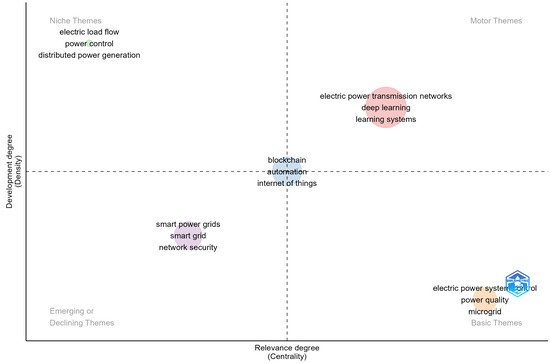 The thematic map highlighted in Figure 14 organizes research topics in AI and blockchain for smart grids into four categories based on their relevance (centrality) and development (density).