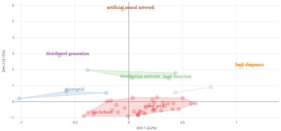 Figure 15 depicts the conceptual structure map derived from a Correspondence Analysis of the most frequent author keywords in our dataset. The two axes (Dim 1 and Dim 2) explain a substantial portion of the variance (4.2% and 4.15%, respectively). Overall, the map reveals several distinct keyword clusters, each representing a specific thematic focus. In the bottom-left quadrant (shown in red), a large cluster emerges around renewable energy, cybersecurity, blockchain, and smart grid-oriented terms. The proximity of these keywords suggests a strong research interest in integrating distributed energy resources and secure data architectures (e.g., blockchain) to enhance smart grid operations. Toward the center quadrant (in green), keywords like distributed network and fault detection appear, indicating a specialized focus on power flow management and the deployment of decentralized energy assets. In contrast, the orange clusters (top-center and right) center on advanced computational approaches, featuring terms such as artificial neural network and fault diagnosis. Their positioning suggests the application of AI-driven methods for predictive maintenance, anomaly detection, and early fault identification in smart grid components. Taken together, these clusters illustrate the diverse nature of research on AI and blockchain for securing smart grids. On one side, there is a strong interest in decentralized generation and secure architectures; on the other, advanced data-driven methods and diagnostic tools address emerging cybersecurity and reliability challenges.