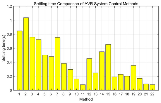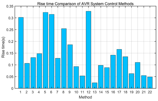 As shown in Table 1, these studies focus on combining different algorithms, types of PID controllers, and objective functions to optimize the performance of AVR systems. Among them, PID variants constitute more than half of the cases, with a predominant emphasis on fractional-order PID and PIDD2 controllers. The ZLG method is the most frequently adopted objective function, followed by ITAE. Additionally, hybrid metaheuristic algorithms have begun to emerge in recent research, such as SA–MRFO, EO-ERWCA, and SA–GTO. Figure 1, Figure 2 and Figure 3 present comparative evaluations of the overshoot, rise time, and settling time characteristics produced by the AVR system control methods enumerated in Table 1, respectively.