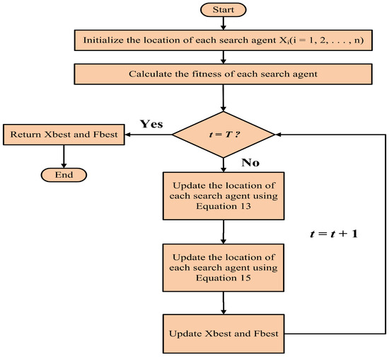 where denotes the location of the randomly selected individual and A and C are key parameters designed to regulate the behavioral patterns of search agents. Their detailed mathematical formulations are provided in Reference [39]. When , all whales stochastically select another individual within the group and adjust their locations in a direction diverging from the chosen one, thereby enhancing the algorithm’s global search capability.
