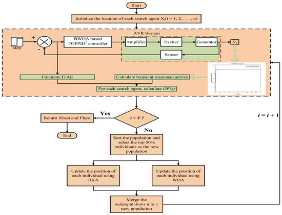 This study systematically investigates the optimization of fractional-order PIDD2 controllers for automatic voltage regulators using the novel Black-winged kite and Whale Optimization Algorithm (BWOA). The proposed BWOA implements an innovative hybrid optimization framework that strategically integrates two metaheuristic algorithms through a hierarchical population management approach. The algorithm first ranks all individuals in ascending order based on their objective function values. The top 50% of high-performance candidates are then divided into two subpopulations undergoing parallel optimization processes: one subpopulation is updated using Black-winged Kite Optimization principles, while the other evolves through Whale Optimization Algorithm mechanisms. The updated subpopulations are subsequently merged to form a new population, enabling extensive exploration of high-quality solution spaces while maintaining population diversity and preventing premature convergence to local optima. For controller optimization, a composite objective function integrating Integral Time Absolute Error (ITAE) and ZLG criteria was implemented. Extensive numerical simulations were conducted to evaluate the proposed controller’s performance across multiple metrics: transient response characteristics, stability robustness, parameter uncertainty tolerance, trajectory tracking capability, and disturbance rejection effectiveness. Comparative analyses with existing controllers from the literature demonstrate the superiority of the BWOA-optimized controller in most evaluation aspects.