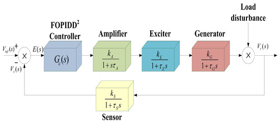 The closed-loop transfer function of the FOPIDD2-controlled AVR system is given by Equation (7). Figure 6 illustrates the block diagram of an AVR system integrated with a PID controller.