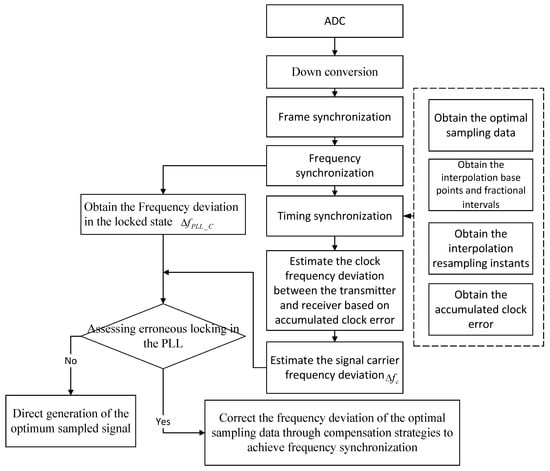 The time synchronization module is a closed-loop system comprising an interpolation filter, a timing error detector, a loop filter, and a numerically controlled oscillator (NCO). Specifically, the interpolation filter employs a polyphase decomposition interpolation algorithm based on the Farrow structure. It generates interpolation coefficients through polynomial fitting and performs fractional interval resampling on the input signal.