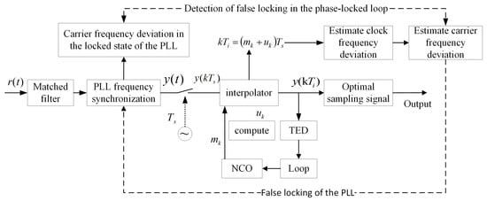 where represents the sampling instant of the received signal when two samples per symbol are taken based on the receiver’s clock, while denotes the interpolation instant generated by the bit synchronization module. The accumulated clock error captures the cumulative effect of clock drift between the transmitter and receiver.