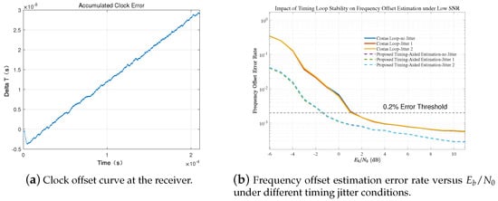 In contrast, the proposed bit synchronization-assisted frequency correction method does not require any additional training sequences, as it derives frequency offset information directly from the clock offset obtained during the timing recovery process. This makes our method lightweight and well-suited for low-SNR and real-time systems.