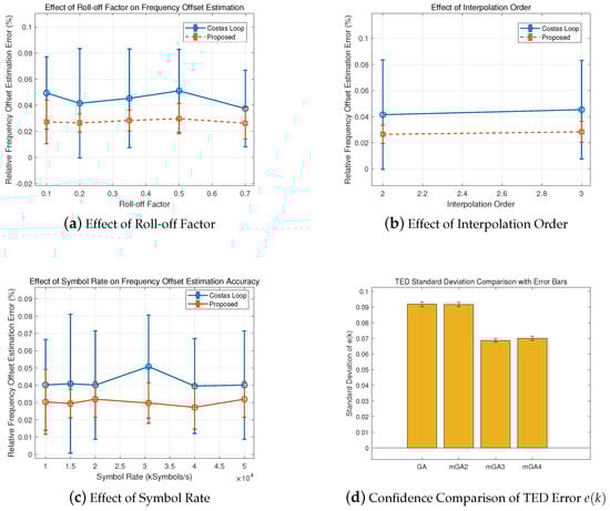 Figure 8 further illustrates the influence of roll-off factor, interpolation filter order, and symbol rate on frequency offset estimation (subfigures a−c), and compares TED performance (subfigure d). All results are averaged over 100 trials, with error bars denoting standard deviations and 95% confidence intervals.