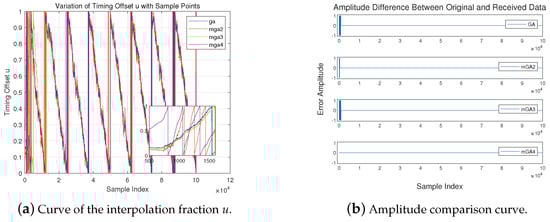Figure 9 illustrates two key performance aspects of the proposed timing recovery algorithm. Subfigure (a) shows the evolution of the NCO output , where the mGA4 algorithm achieves significantly faster convergence compared to baseline methods, requiring fewer symbols to reach synchronization. This accelerated convergence shortens the acquisition period and improves overall timing stability. Subfigure (b) further validates the practical impact by comparing the received signal amplitude after bit synchronization correction under conditions of frame synchronization offsets and insufficient pilot symbols due to large frequency deviations. While GA, mGA2, and mGA3 exhibit initial bit errors—even under high SNR—mGA4 rapidly converges and maintains a zero bit error rate, demonstrating superior robustness and synchronization reliability under challenging conditions.