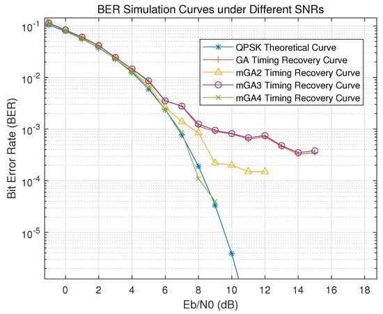 To further validate system robustness under practical conditions, the BER performance was quantitatively evaluated across various SNR levels and synchronization scenarios. As illustrated in Figure 10, the proposed mGA4 algorithm consistently outperforms GA, mGA2, and mGA3 in terms of BER, particularly in the presence of frame synchronization offsets and limited pilot symbols. These improvements are attributed to faster timing convergence, which effectively reduces the vulnerability window during the initial phase of symbol recovery.
