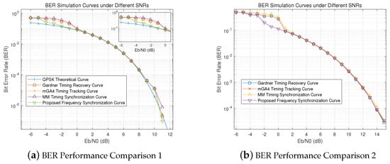 Additionally, an enhanced Gardner algorithm with self-noise suppression capabilities, referred to as the mGA3 algorithm, was proposed in []. This method significantly outperforms other improved Gardner algorithms in terms of timing noise error reduction. However, its synchronization speed is relatively slow.