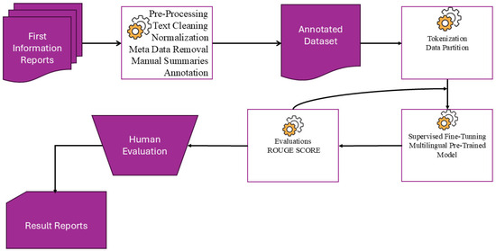 We have developed a systematic framework for creating abstractive summarization systems that manage Urdu legal text documents, as shown in Figure 1. The first step involved data collection for the first information report (FIR). Later, we undertook extensive linguistic pre-processing, which included multiple stages of cleaning, normalization, and tokenization procedures to efficiently handle the specificities of legal language. The dataset was divided into distinct partitions for training, validation, and testing to achieve uniform distribution among legal documentation categories. State-of-the-art multilingual transformer models, namely the mBART and the mT5, along with their variants, Base, Small, and Large, were fine-tuned with optimal training hyperparameters tailored to our summarization task.