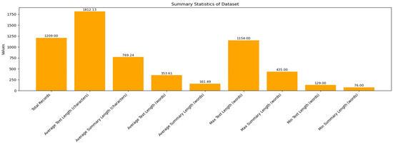 This research paper has utilized 1209 legal documents as shown in Figure 3, which contain complete source material and summarization sections. A thorough statistical examination of the corpus shows essential information about its structural characteristics and complexities that could affect summary model training. On average, the text length is 1811.13 characters, while the summary length is 769.2 characters, indicating that the summaries are typically one-third the length of the original text. The average text length is 353.61 words, whereas the average summary length is 161.3 words, demonstrating the high compression ratio required for effective summarization. The dataset also exhibits significant compression.