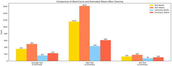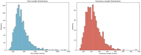 An analysis of the text and summary length distribution provides valuable insights into the underlying structure of the dataset as shown in Figure 4. According to the histogram distribution above, most texts are between 200 and 400 words, while a small subset exceeds 600 words. Similarly, summary length distributions primarily fall between 100 and 250 words. The variation in distribution between text and summary lengths suggests that the model needs to be refined to prevent redundancy in longer texts while mitigating the risk of truncation in shorter outputs.