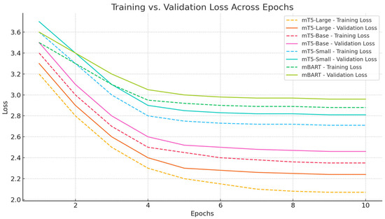 Observation: All models exhibit converging loss curves; however, the mT5-Large displayed the most stable and lowest loss trajectory, indicating superior learning capabilities, while the mT5-Small required more epochs or data to achieve the same level of convergence. In the meantime, mBART demonstrated marginally less stability and plateaued earlier, as shown in Figure 6.