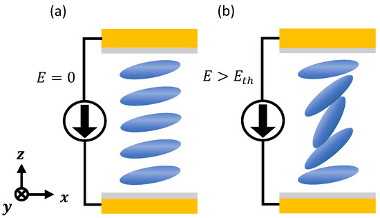 In the unbiased state, the LC director is uniformly aligned along the x axis (Figure 1a). When the applied field is below the threshold electric field Eth in the z direction, the LCs maintain their initial state. However, when the applied field exceeds Eth and the LCs have positive dielectric anisotropy at the operating frequency of the bias voltage, the LC directors rotate toward the direction of the electric field (Figure 1b); this reorientation phenomenon is known as the Fréedericksz transition [34]. Additionally, when the applied field is removed, the rotated LC directors relax back to their initial state due to elastic forces of LCs. Because of this behavior, the LC can be tuned reversibly and reconfigured.