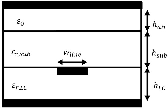 The proposed filter adopts a multilayer microstrip line topology. A microstrip line consists of a signal line and a ground plane separated by a dielectric, allowing an external voltage bias to reorient the LC directors. The multilayer microstrip line filled with the LCs comprises three dielectric layers: air, a substrate patterned with the signal line, and an LC layer, as illustrated in Figure 2. To enable reconfigurable operation, the LC layer is placed between the substrate and the ground plane.