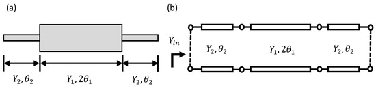 To achieve wideband BPF and operate LCs by voltage bias, we adopted the open-circuited SIR technology. The open-circuited SIR consists of two transmission lines having different characteristic admittances, Y1 = 1/Z1 and Y2 = 1/Z2 (Figure 3a). Also, the electrical length of each section is defined as θ1 and θ2, and the structure is terminated by open circuits at both ends. To analyze the resonant characteristics, the structure is examined using an equivalent transmission line model (Figure 3b). Assuming that θ1 = θ2 = θ > 0, the input admittance Yin can be expressed as