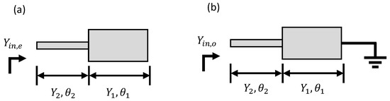 where RZ = Z2/Z1 = Y1/Y2 is the impedance ratio. Since the structure exhibits symmetry, even-mode and odd-mode analysis can be applied (Figure 4). For the even-mode case, the input admittance Yin,e is given by