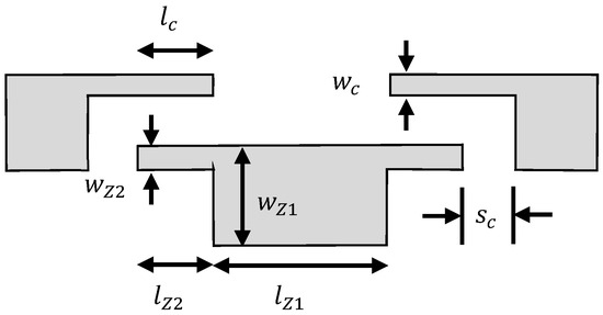 Next, simulations were conducted under various lc conditions to observe the effect of coupling degree at a fixed RZ = 5. As shown in Figure 7b, increasing the lc enhanced the coupling strength of the coupled lines, significantly reducing the insertion loss (IL) difference between the adjacent frequencies. By further increasing lc, similar to lZ2, a wideband and flat filter can be achieved. In the final design structure, capacitive-ended interdigital coupled lines were employed to enhance the overall coupling capacitance, as they provide a significantly wider coupling area compared to the normal coupled lines [38].